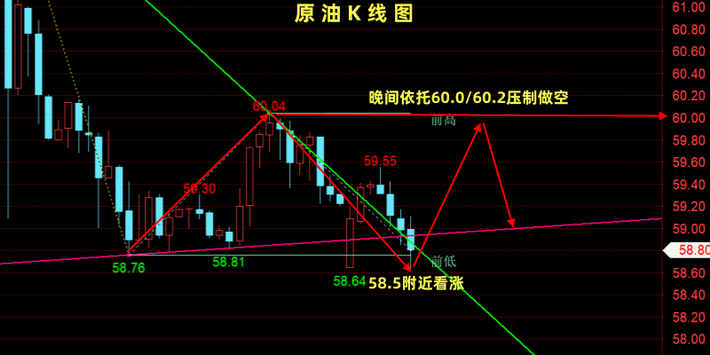 多单:激进58.5±0.2区间 ,稳健57.7±0.2区间,止损‌:各0.6左右,目标位‌:61.8附近!